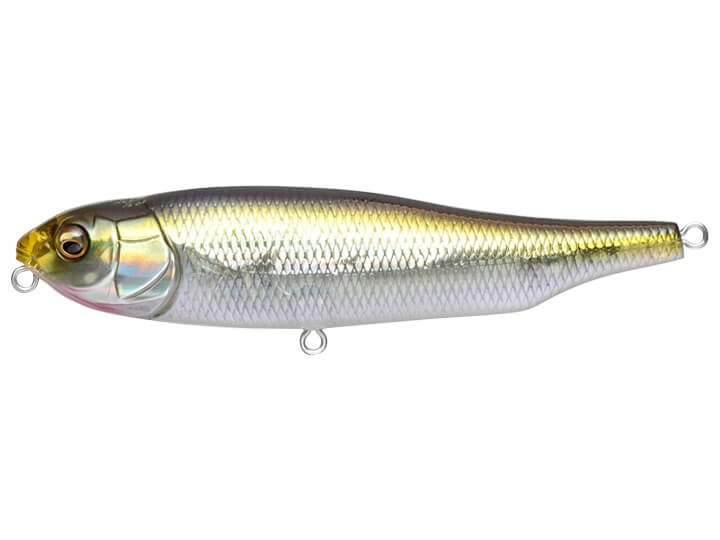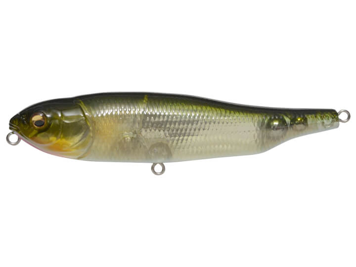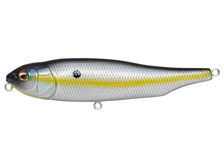 Driven by this laterally-moving weight, Megabass Giant Dog-X rolls flat against the water as it walks, giving predators underneath an irresistible flash of its detailed profile. If a pencil bait simply skates left and right without rolling, it creates less surface activity and only shows its slim belly to the fish below.