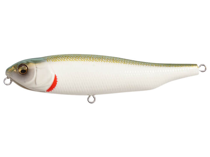 Driven by this laterally-moving weight, Megabass Giant Dog-X rolls flat against the water as it walks, giving predators underneath an irresistible flash of its detailed profile. If a pencil bait simply skates left and right without rolling, it creates less surface activity and only shows its slim belly to the fish below.